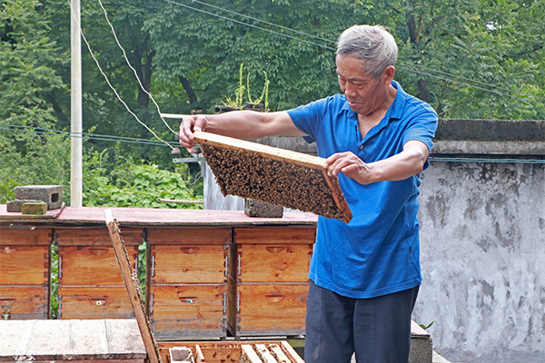 冉光國在查看蜜蜂的生長情況。