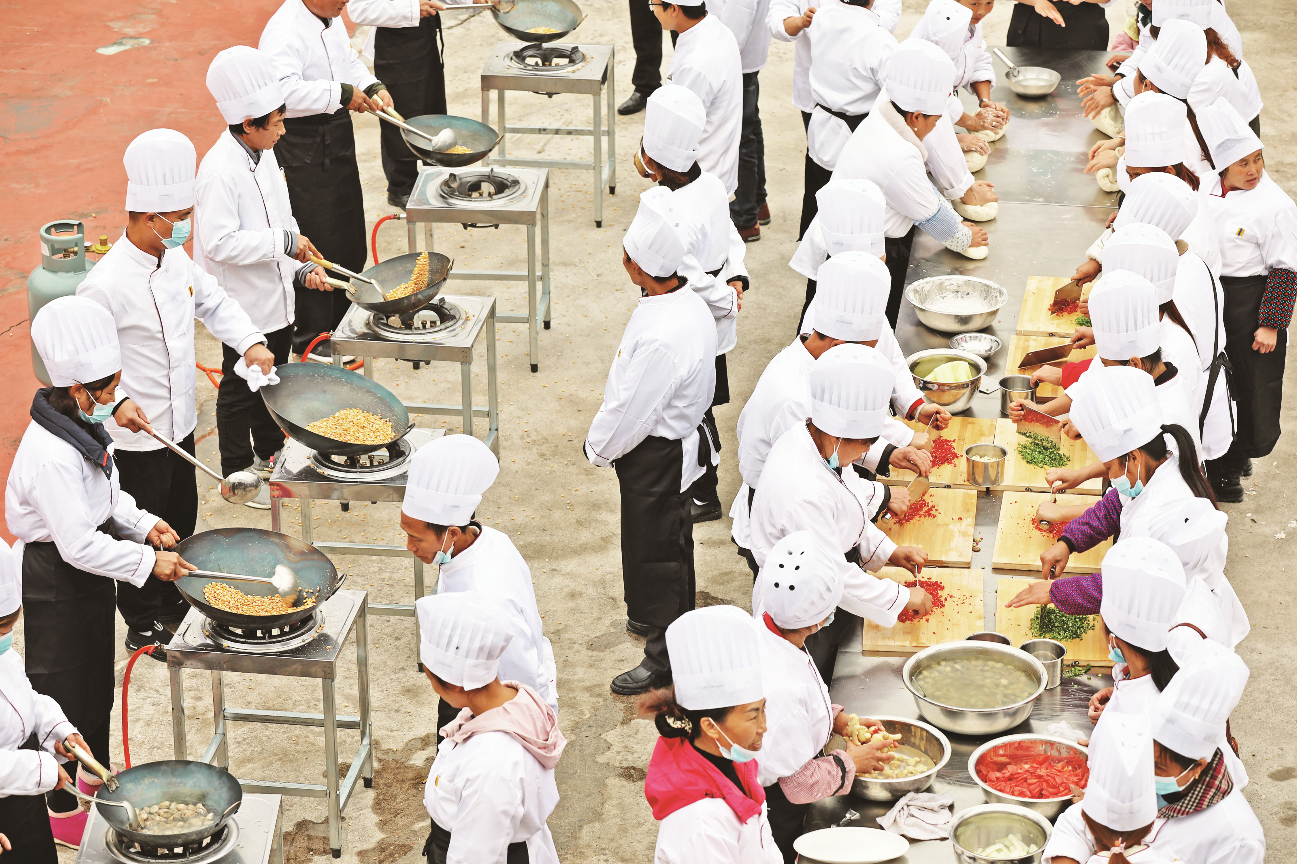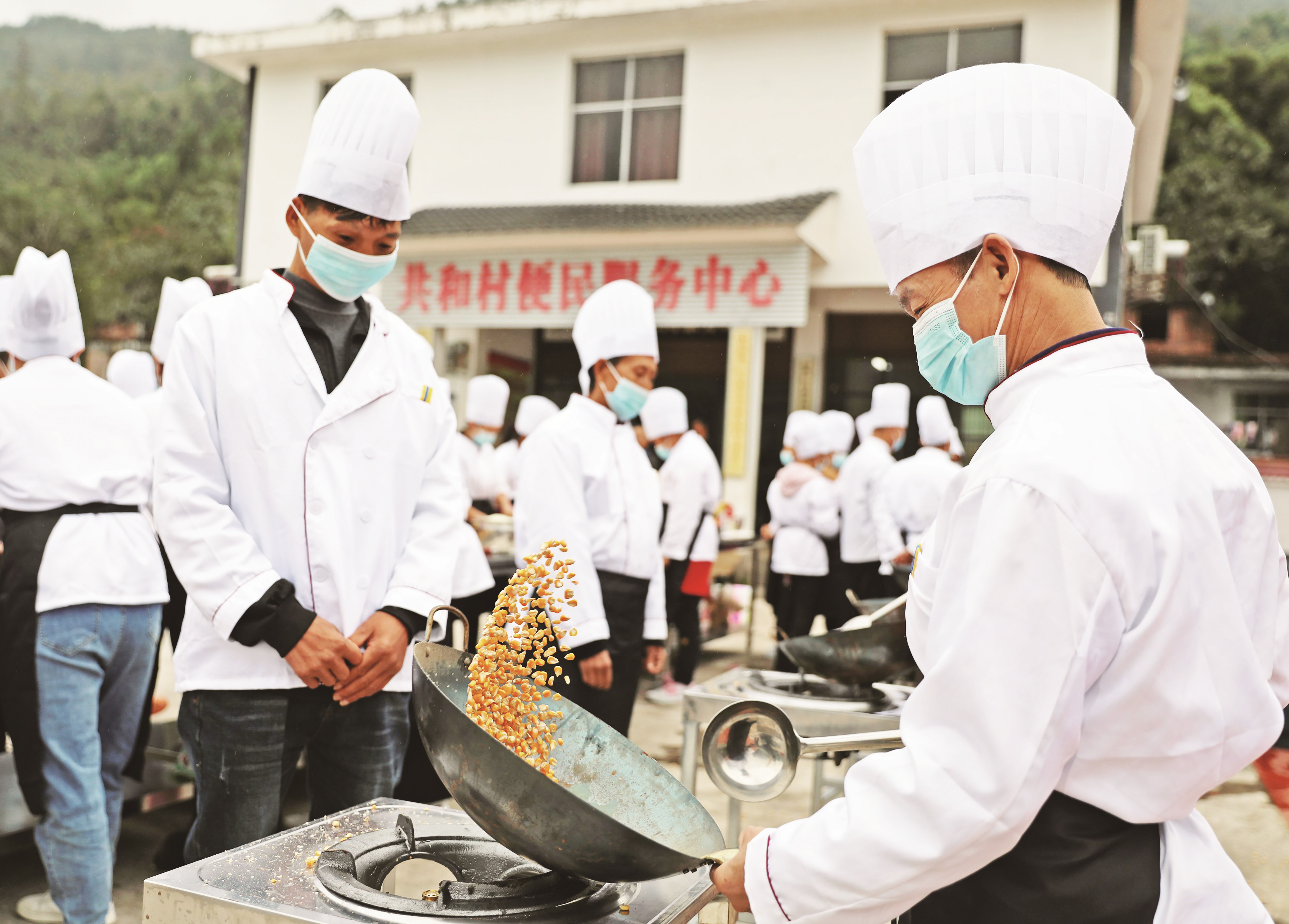 10月19日,高谷鎮(zhèn)共和村便民服務(wù)中心的便民廣場,變成了烹飪的“課堂”,50多名村民正在這里學(xué)習(xí)烹飪。