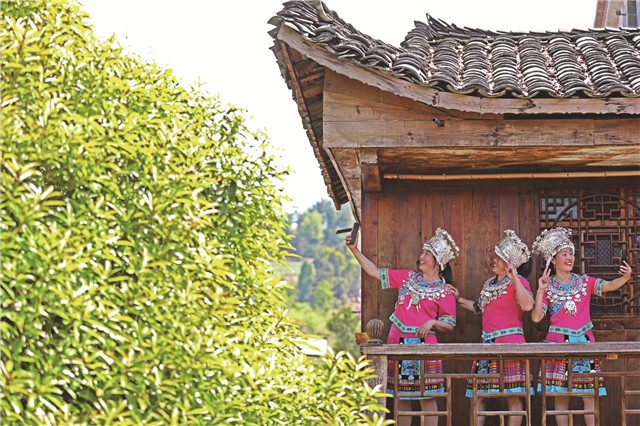 4月8日,在梅子埡鎮佛山村7組的古苗寨,游客身著苗族服裝,在苗家吊腳樓上拍照游玩,體驗古苗寨的獨特韻味。