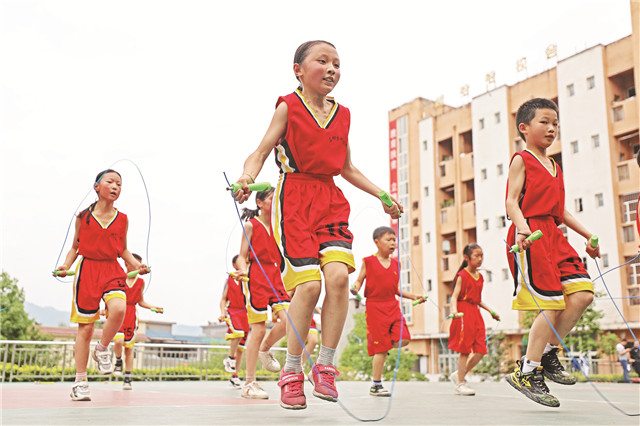 近日,石柳鄉(xiāng)中心校的孩子們利用課余時間在操場上練習(xí)跳繩。