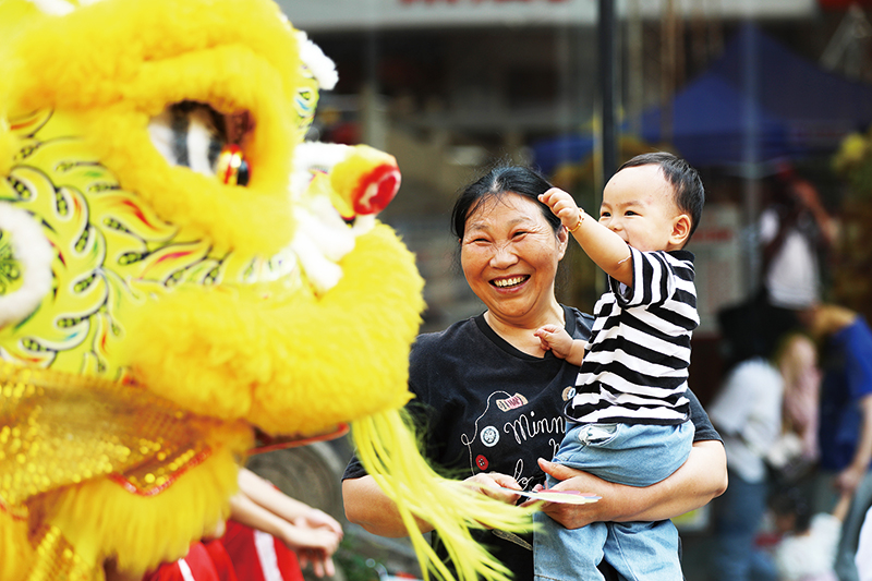 舞獅表演的演員正在與群眾互動,逗樂小朋友。