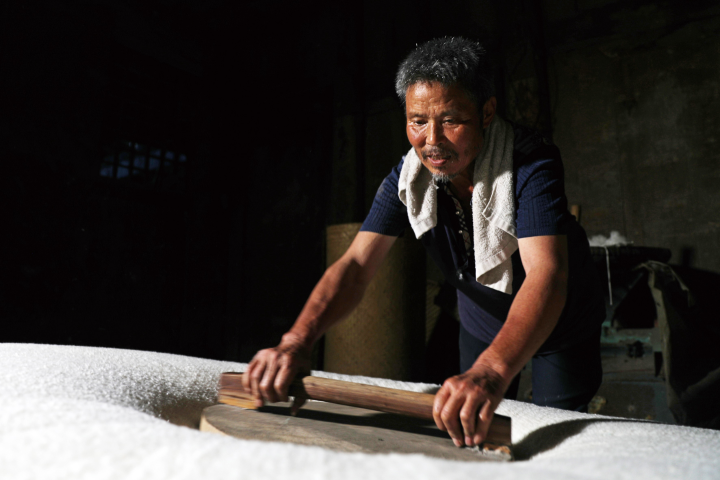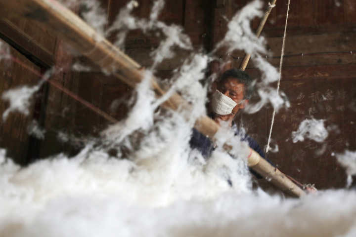 “現在,很多人都放棄了傳統制作棉絮的手藝?!敝x剛華說,隨著生產技術的進步,機器制作棉絮逐漸取代了純手工彈棉花,但是,每當有人提出需要用傳統手工制作棉絮的時候,他也會背起弓竿、掛上彈花弓,用傳統手法制作棉絮。