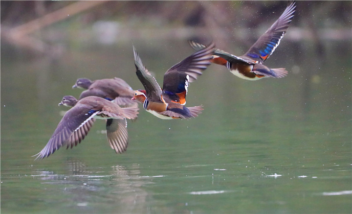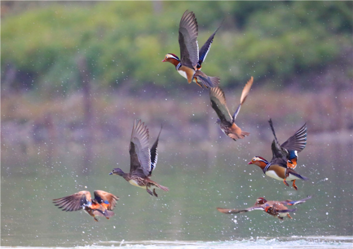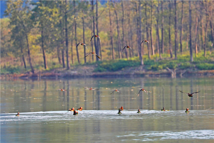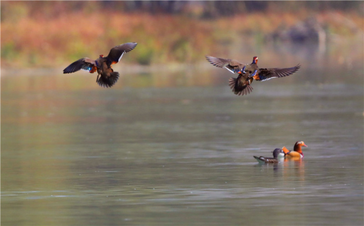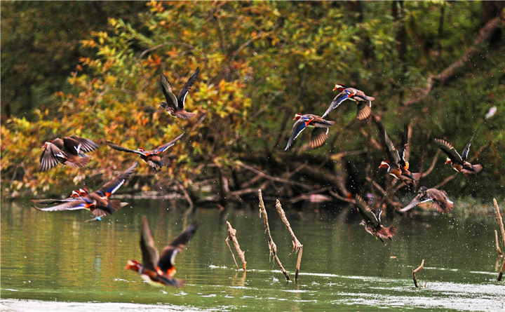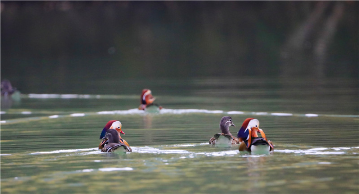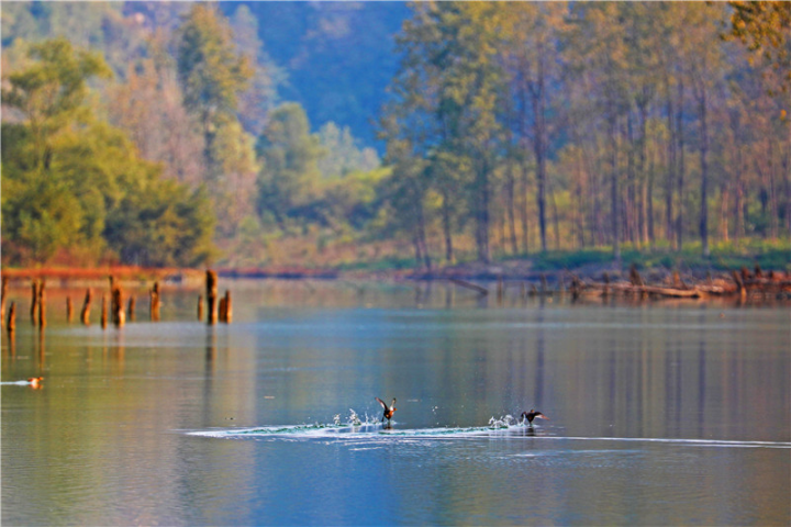 11月9日,在彭水諸佛江鹿角段的江面上,一群國(guó)家二級(jí)保護(hù)動(dòng)物鴛鴦?wù)谒嬉捠场蛩嗖实挠鹈c青山碧水相映成趣,構(gòu)成一幅幅美麗的生態(tài)畫卷。