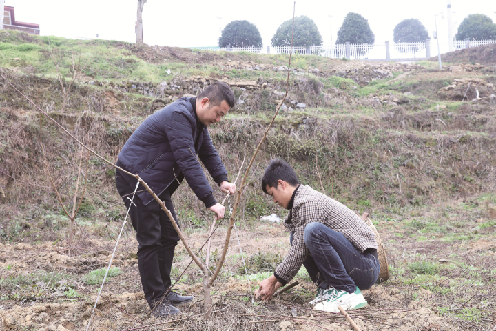 重慶彭水網 (作者 趙琴)3月6日,在紹慶街道天臺村桃樹種植基地,村民們正忙著進行田間管理,為桃樹壓枝,為今年豐產豐收打牢基礎。據了解,近年來,天臺村利用村產業發展資金成立生態農業公司,流轉400畝土地,種植鷹嘴蜜桃和黃桃,壯大村集體經濟的同時為村民增加增收渠道。