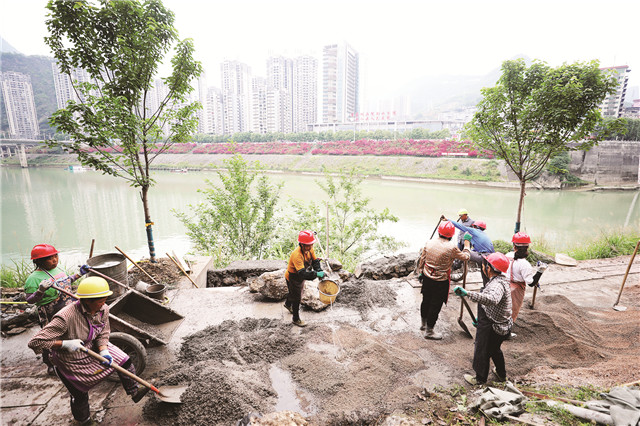 重慶彭水網(作 者:趙 勇)5月15日,在烏江東路健身休閑步道建設項目民政局濱江路段,工人正在忙著和砂漿、砌堡坎,加快工程建設。據了解,該項目總建設面積24000平方米,其中改建綠地面積20000平方米,縣城市管理局在項目建設中堅持文化元素與景觀建設的有機融合,將占地約50000平方米的烏江東路護坡綠地打造成集觀景、休閑、健身為一體的濱江帶狀公園。
