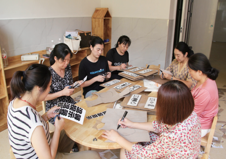 民族幼兒園的老師們正在裁剪著開學(xué)需要用到的環(huán)創(chuàng)作品。