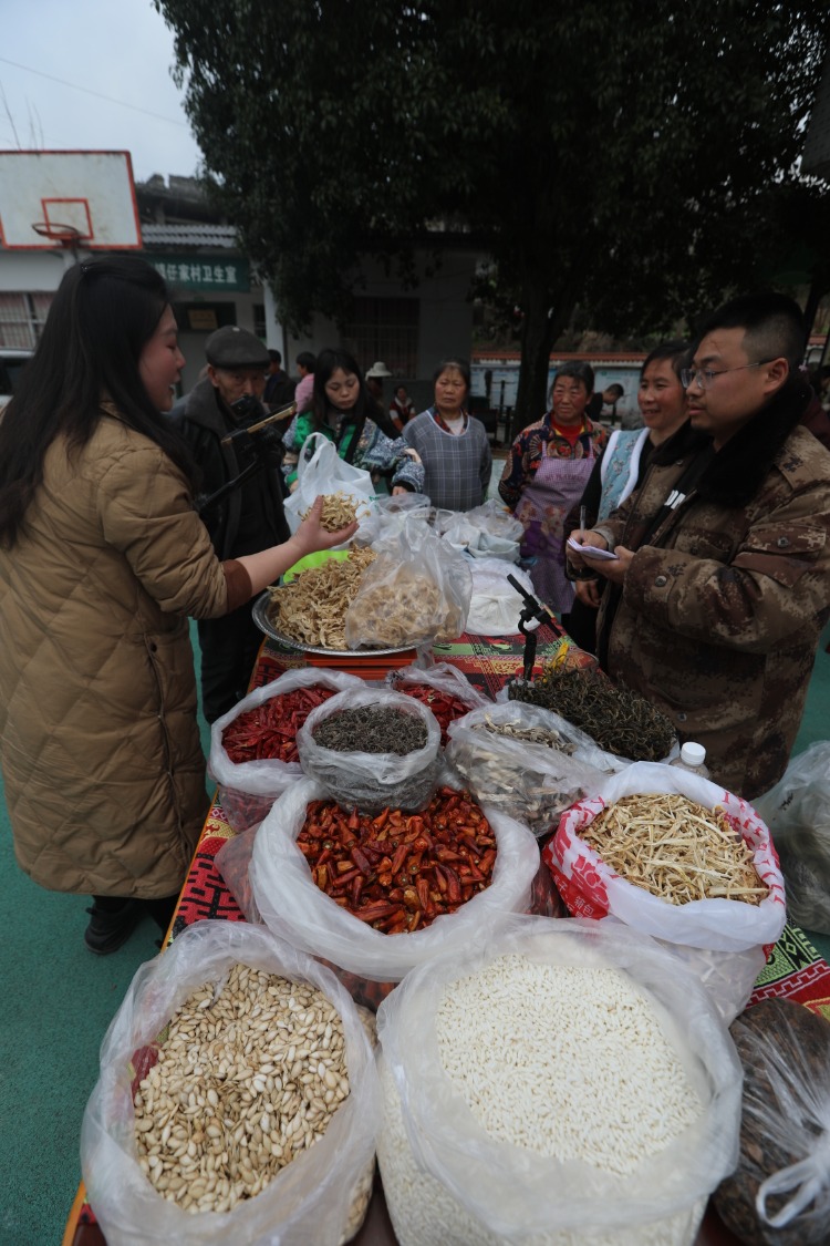 喧鬧的現場,一位年過七旬的婆婆擠進了人群,“我這有胡豆、南瓜干、紅苕粉些,你們幫我賣了嘛。”