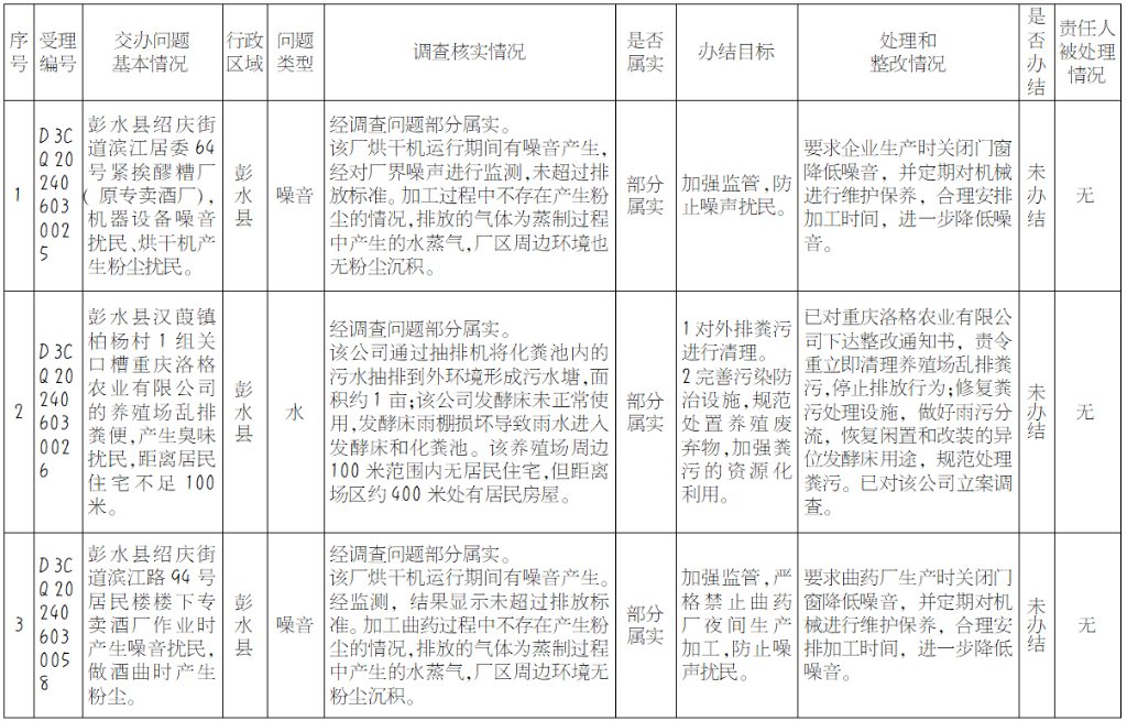 截至2024年6月14日,對中央第六生態環境保護督察組向重慶市移交的第二十七批群眾信訪舉報件,涉及彭水自治縣3件,已按要求調查處理,現向社會公開。