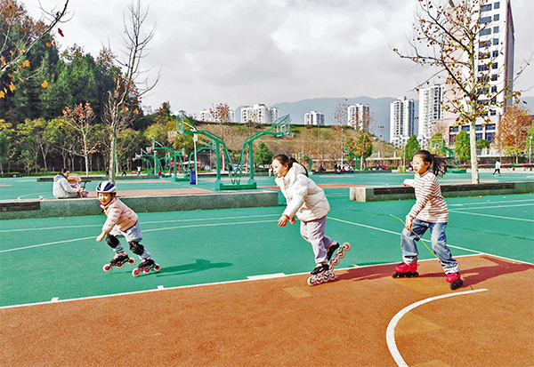 12月15日,陽光明媚,市民們紛紛走出家門,沐浴在冬日暖陽中,享受戶外健身運動的快樂。圖為彭水新城全民健身中心,小朋友們在玩輪滑。